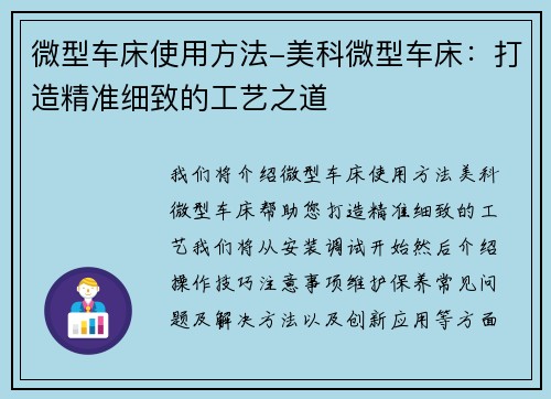 本文将详细阐述小微型车床和微型普通车床的特点和应用领域。首先介绍小微型车床和微型普通车床的定义和分类,然后从机械结构、加工能力、精度控制、使用范围、应用领域和市场需求等六个方面进行详细阐述。最后对小微型车床和微型普通车床进行总结归纳。 一、定义和分类 小微型车床是一种用于加工小型工件的机床,通常用于教学、科研和家庭DIY等领域。根据其结构和功能的不同,小微型车床可以分为手动小微型车床、数控小微型车...
